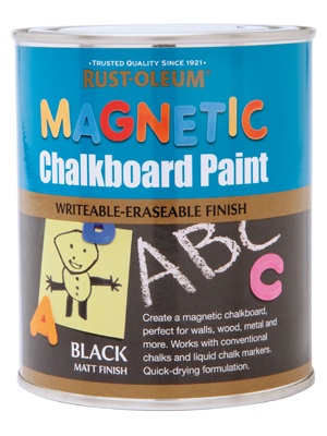 Rust-Oleum Magnetic Chalkboard Paint to magnetyczna farba do tablic. Po nałożeniu farba RO tworzy na powierzchni magnetyczną tablicę do pisania. Jest wytrzymała oraz odporna na zarysowania.