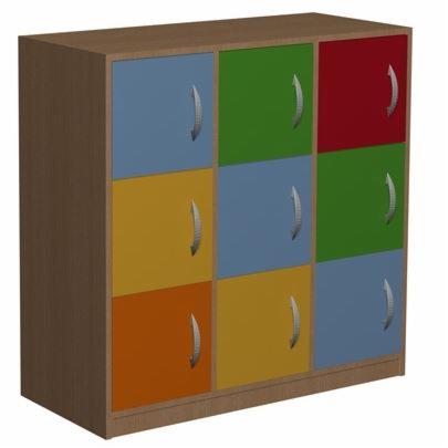 Szafka z indywidualnymi skrytkami dla każdego ucznia. Kolorowe regały z półkami sprawiają, że przebywanie w klasie wyposażonej w takie meble będzie czystą przyjemnością, a dzieci chętnie będą trzymały w nich swoje przybory czy pomoce. Głębokość szafki 45cm sprawia że rzeczy umieszczane za drzwiczkami nie bedą się niszczyły, wyginały.