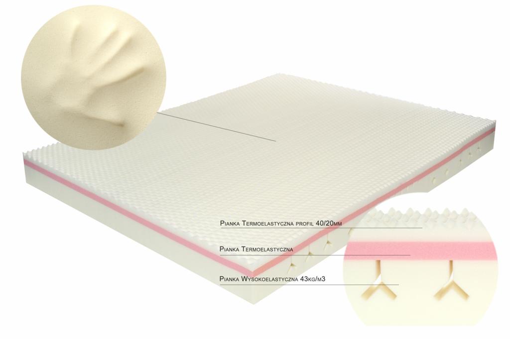 Warstwę górną stanowią dwa rodzaje pianek termoelastycznych. Ich połączenie powoduje poczucie wygody i komfortu. Pianka ząbkowana daje dodatkowo efekt mikromasażu, a po paru sekundach zaczyna pracować sztywniejsza pianka termoelastyczna, co wpływa na niebywałe uczucie relaksu oraz odprężenia podczas snu. Materac ma właściwości przeciwodleżynowe oraz rehabilitacyjne.