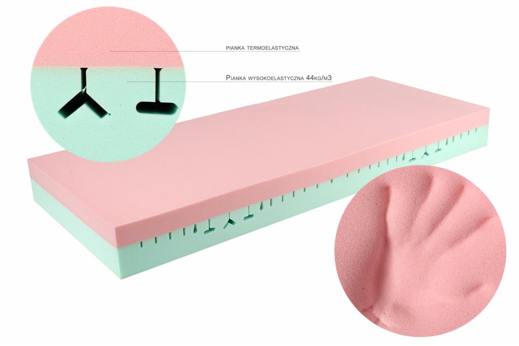 Górna warstwa materaca jest wyjątkowo miękka dzięki piance termoelastycznej, która pod wpływem temperatury ciała przyjmuje jego kształt idealnie dopasowując się do kręgosłupa, a jednocześnie redukując nacisk na naczynia krwionośne. Dolną warstwę stanowi pianka wysokoelastyczna, która znacznie podnosi komfort materaca oraz wyróżnia się trwałością i odpornością na odkształcenia. Dzięki temu materac posiada właściwości rehabilitacyjne oraz przeciwodleżynowe.