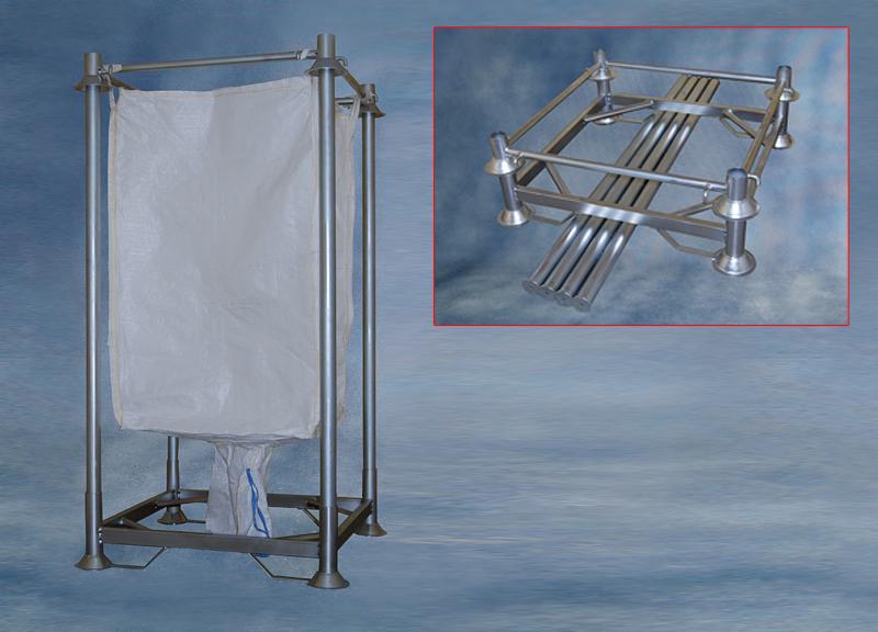 Stelaż o konstrukcji rurowej do worków big-bag. Wymiary standardowe 1115x 1115 x h 2050 mm lub 1115 x 1115 x 1145 mm wysokości. Opcja z wzmocnieniem podstawy pod paletę EUR. Maksymalne obciążenie stelaża: 1000 kg, Piętrowanie: 2/1. Cynkowanie ogniowe lub galwaniczne.