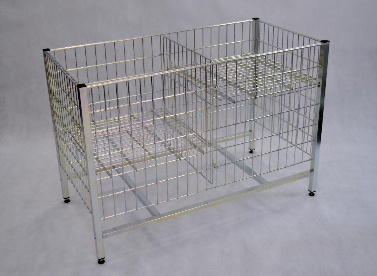 Kosz siatkowy, ekspozycyjny, z regulowanymi półkami wewnętrznymi, cynkowany galwanicznie. Przeznaczony do ekspozycji odzieży, wyrobów przemysłowych, zabawek itp. Dostępny w 3 różnych wymiarach , 1, 1 mm.