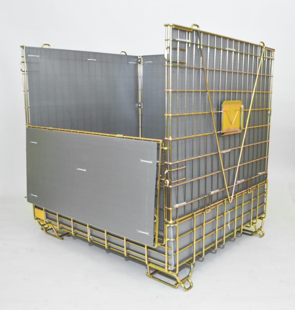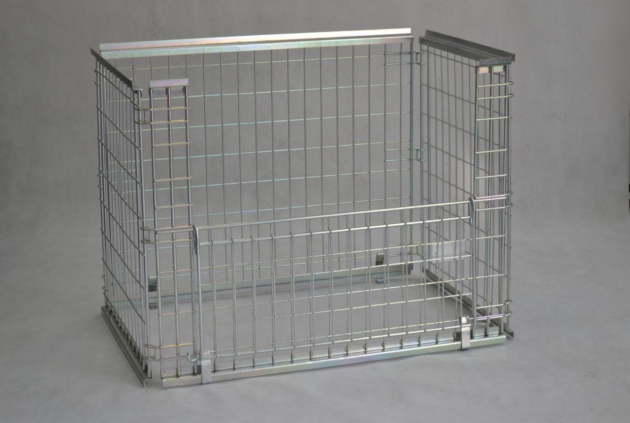 Kosz siatkowy o wymiarach 1200 x 1100 x 1200 mm wysokości, składany, z dzieloną przednią ścianą, ułatwiającą rozładunek. Ładowność do 450 kg. Możliwość piętrowania do 5 poziomów.