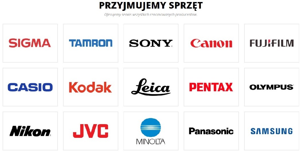 Nasi technicy zajmują się serwisem sprzętów różnych firmy, od aparatów fotograficznych, przez kamery po obiektywy. Wszystkie naprawy wykonywane są na miejscu. Gwarantujemy bezpłatne wyceny i szybkie naprawy.