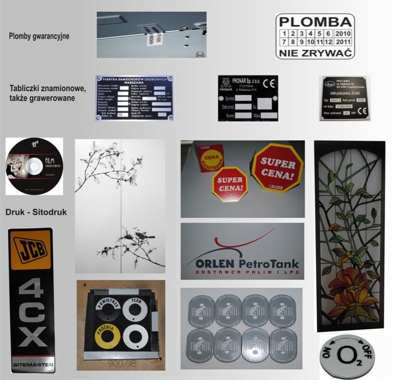 Specjalizujemy się w produkcji wysokiej jakości naklejek w każdym rozmiarze, na różnych materiałach i kształtach na życzenie Klienta, plomb gwarancyjnych, tabliczek znamionowych także grawerowanych, odpornych na czas i czynniki zewnętrzne,nadruk nie ulega zniszczeniu czy zniekształceniu. Wykonujemy również nadruki na materiałach (koszulkach, ubraniach roboczych, kurtkach itp), również nadruki na różnych powierzchniach nie są dla Nas wyzwaniem!