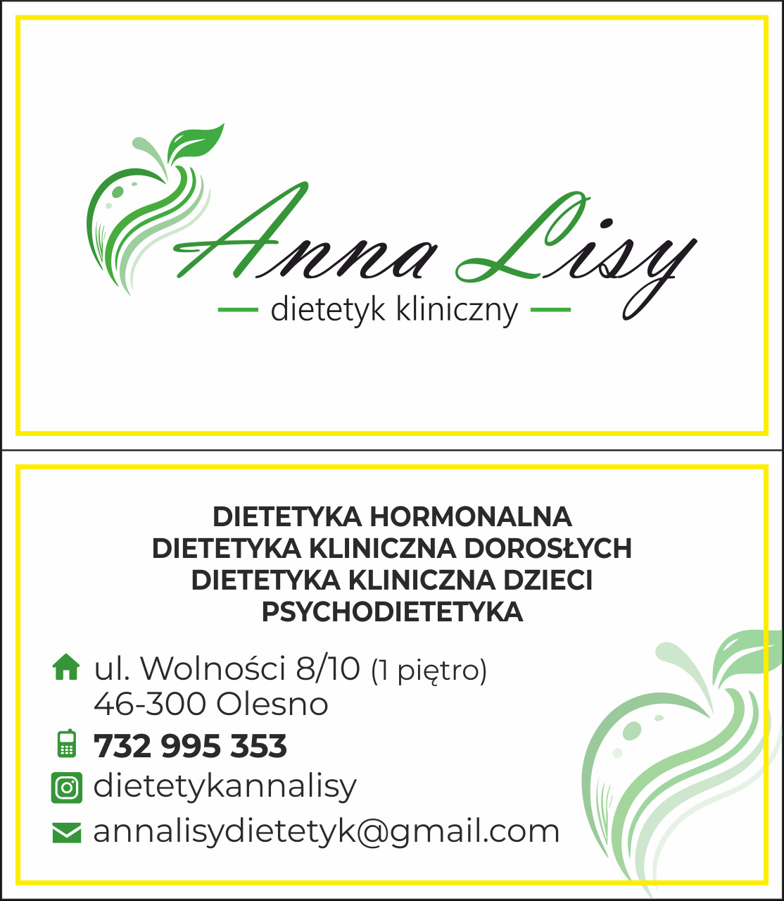 Nazywam się Anna Lisy. Z wykształcenia jestem dyplomowanym dietetykiem, członkiem Polskiego Towarzystwa Dietetyki. Ukończyłam studia w zakresie dietetyki na Wydziale Nauk o Zdrowiu Uniwersytetu Opolskiego.Jestem również psychodietetykiem i kosmetologiem. Moim celem jest wspieranie Cię w budowaniu zdrowych nawyków, które będą towarzyszyć Ci każdego dnia. Moja praca to pasja, a każde spotkanie z pacjentem to okazja do tworzenia trwałych, pozytywnych zmian. Moje doświadczenie w pracy z pacjentami obejmuje zarówno osoby zmagające się z chorobami przewlekłymi, jak i te, które chcą poprawić swoją sylwetkę, zwiększyć energię czy po prostu zadbać o swoje zdrowie na co dzień. Każdy z moich pacjentów otrzymuje spersonalizowany plan żywieniowy, dostosowany do ich stylu życia, stanu zdrowia oraz celów, jakie chcą osiągnąć. W mojej pracy stawiam na edukację żywieniową, ponieważ wierzę, że świadome wybory dotyczące jedzenia mogą mieć długotrwały, pozytywny wpływ na zdrowie. Porady, które ode mnie dostaniesz będą zgodne z „medycyną opartą na faktach” (EBM – Evidence Based Medicine) i „żywieniem opartym na dowodach naukowych” (EBN – Evidence Based Nutrition).