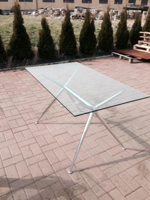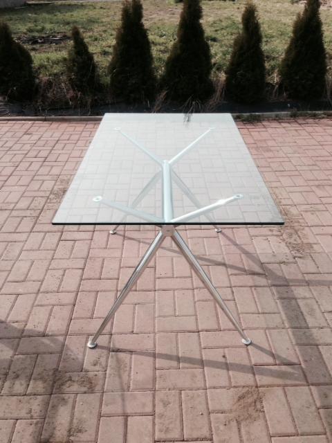 Stół z ekspozycji sklepowej w bardzo dobrym stanie, podstawa metalowa chromowana, blat szklany przeźroczysty. Szkło hartowane o wymiarach 140/80cm.