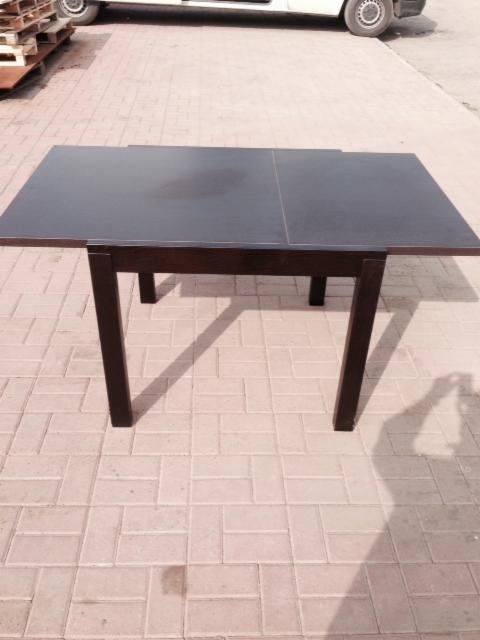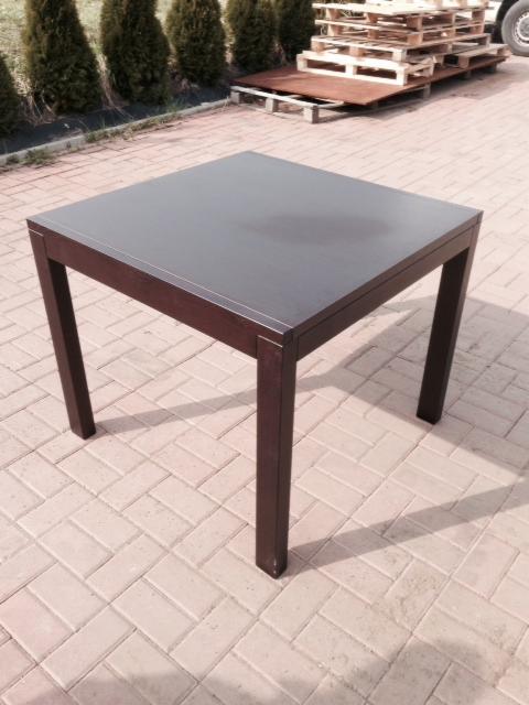 Stół, podstawa drewniana wybarwiana na wenge, blat płyta MDF kolor wenge. Rozmiar 90/90cm rozkłada się 150cm. Stół bardzo ładnie wykończony, blat rozsuwany na rolkach.