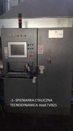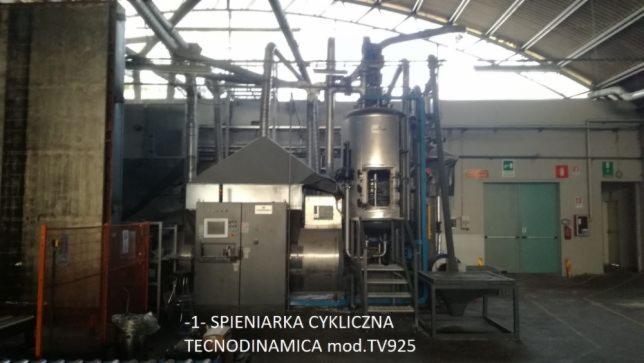 1. SPIENIARKA CYKLICZNA (okresowa) pierwszego stopnia TECNODINAMICA mod. TV925, wykonana ze stali kwasoodpornej INOX + suszarka + inzektor + automatyczny uklad kontroli gestosci kontrolujacy na bierzaco i polaczony z centralnym sterowaniem TECNODINAMICA/SIEMENS. Wszelkie dane i opcje sterownicze wyswietlane na cieklokrystalicznym monitorze dotykowym. Mozliwosc zdalnego sterowania, oraz przesylania danych o wydajnosci produkcji na komputery firmowe. Mozliwosc zdalnego diagnozowania usterek/bledow online. Dzialanie cykliczne gwarantuje system automatycznej kontroli gestosci, dzieki czemu juz w pierwszej fazie spieniania mozemy osiagnac gestosc od 100g/L do 12g/L. Ze spieniarka drugiego stopnia spieniania mozemy otrzymac granulat o gestosci 8g/L.