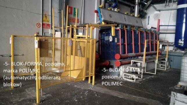 5. BLOK-FORMA (pozioma) POLIMEC, ladowana automatycznie od gory. Ewakuacja bloku odbywa sie rowniez od gory, gorna pokrywa otwierana automatycznie. Blok-forma polaczona jest z automatycznym odbieraczem gotowego bloku styropianowego. Sterowanie automatyczne + pulpit sterowania