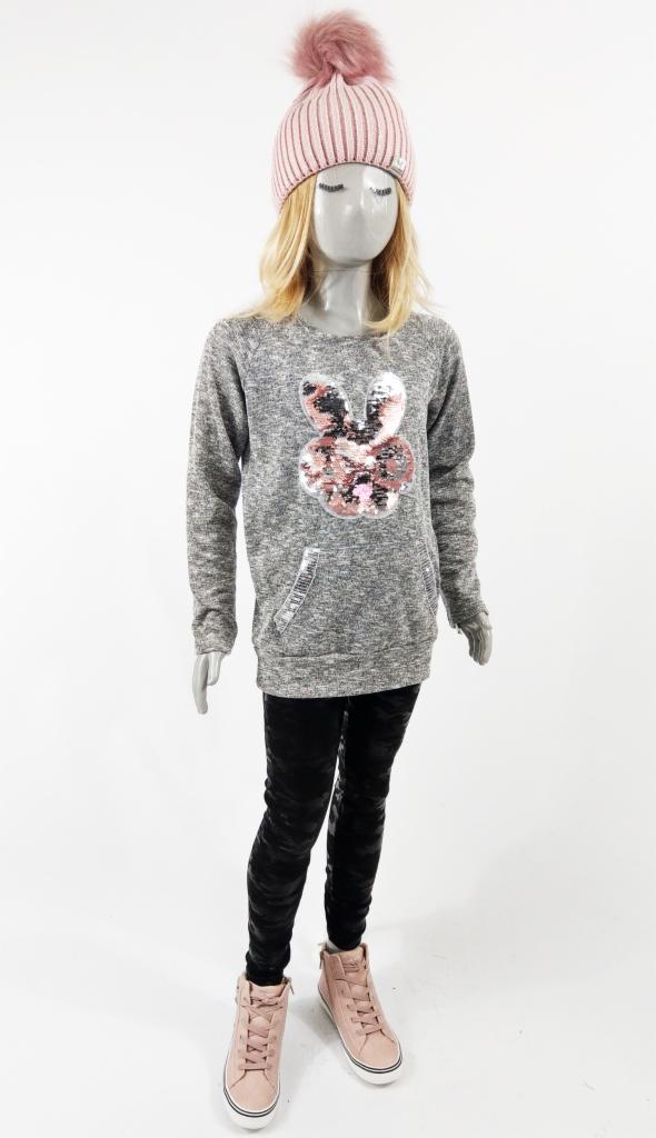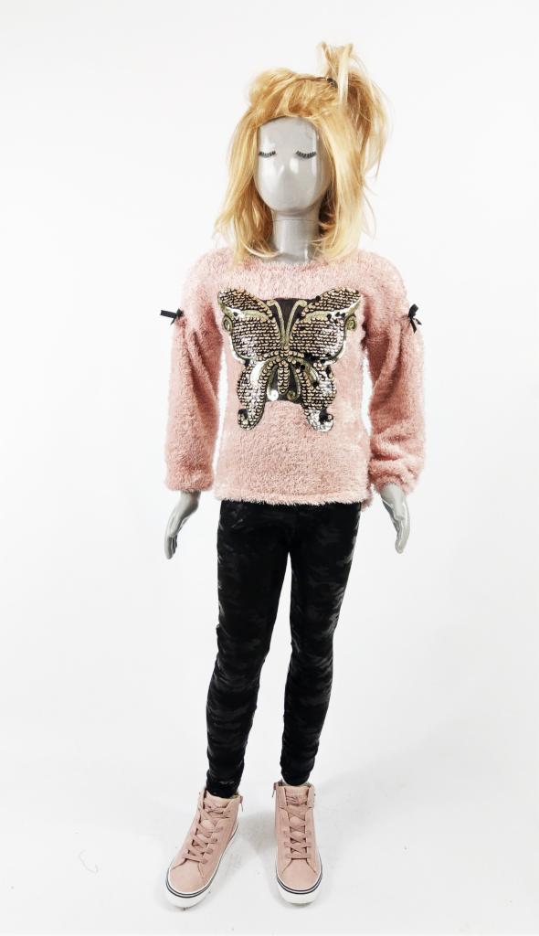 Prosty krój swetra z dłuższym tyłem i bufiastym długim rękawem. Mechaty materiał, miły w dotyku, nie podrażniający. Złota aplikacja mieniące cekiny w kształcie motyla. Naszyte czarne kokardki na ramionach.