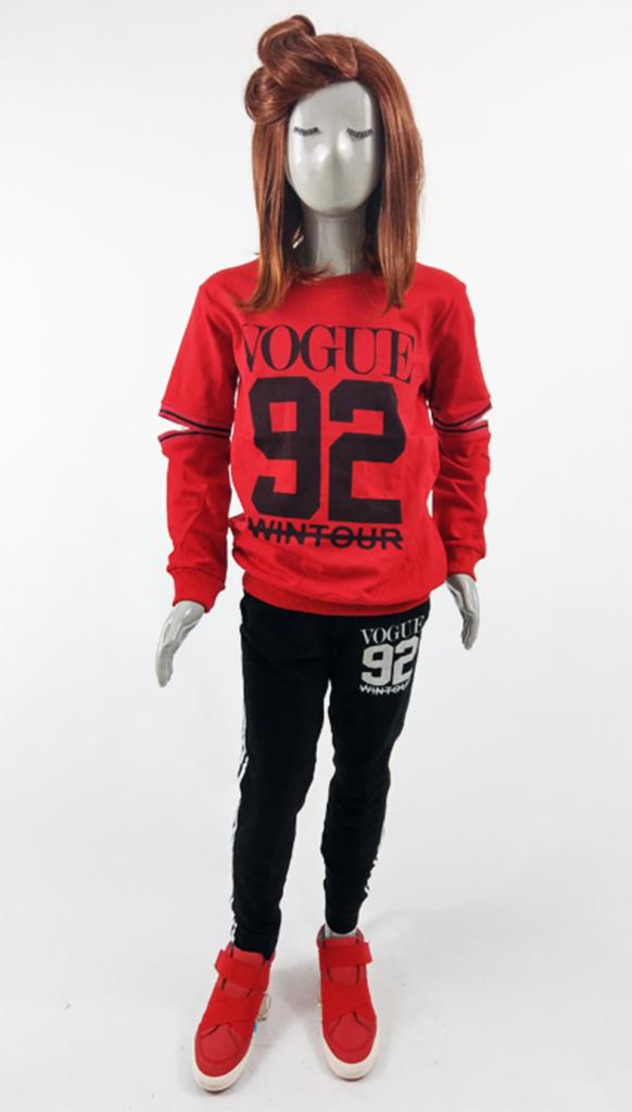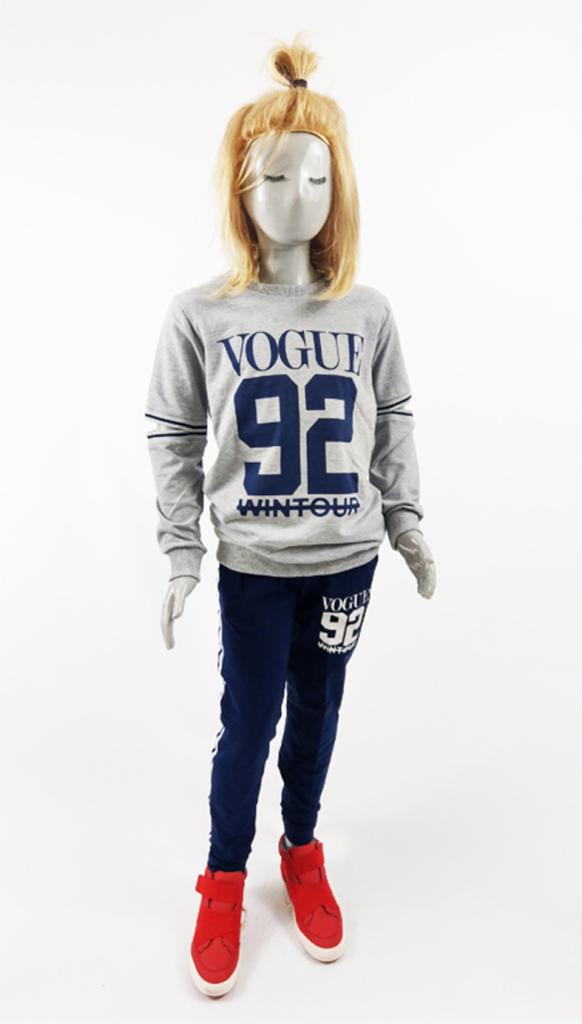 Komplet bluza i spodnie. Długi rękaw. Długie nogawki. Bluza z nadrukiem 92 i wycięciami nad łokciami. Spodnie z nadrukiem 92 na udzie i dwoma pasami po bokach nogawek.