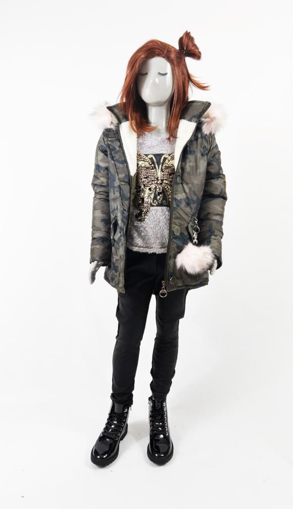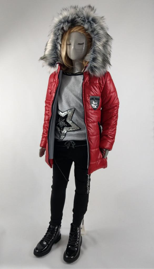 Krój typu A. Długość za biodra. Dłuższa z tyłu. Ocieplana podszyta polarem. Kaptur z odchylanym i odpinanym futerkiem w szarym kolorze. Kieszenie zamykane na suwak z taśmami z napisami. Aplikacja emblemat z przodu.