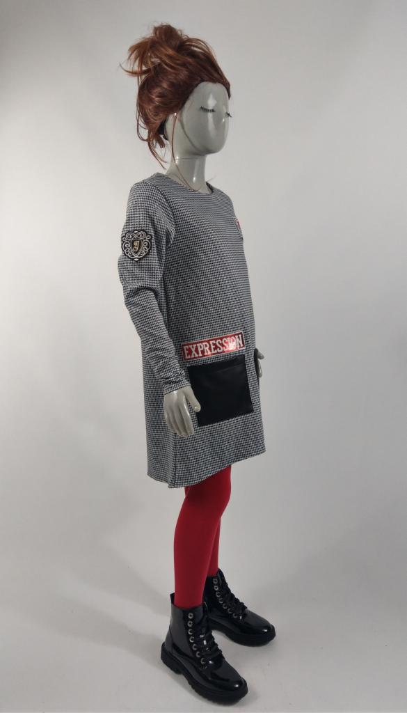 Sukienka typu bombka ściągnięta gumką u dołu. Długi rękaw. Ocieplany materiał. Nadruk Opening (otwarcie) i serca z dekoracyjnymi koralikami. Kieszenie z czerwonym wnętrzem.