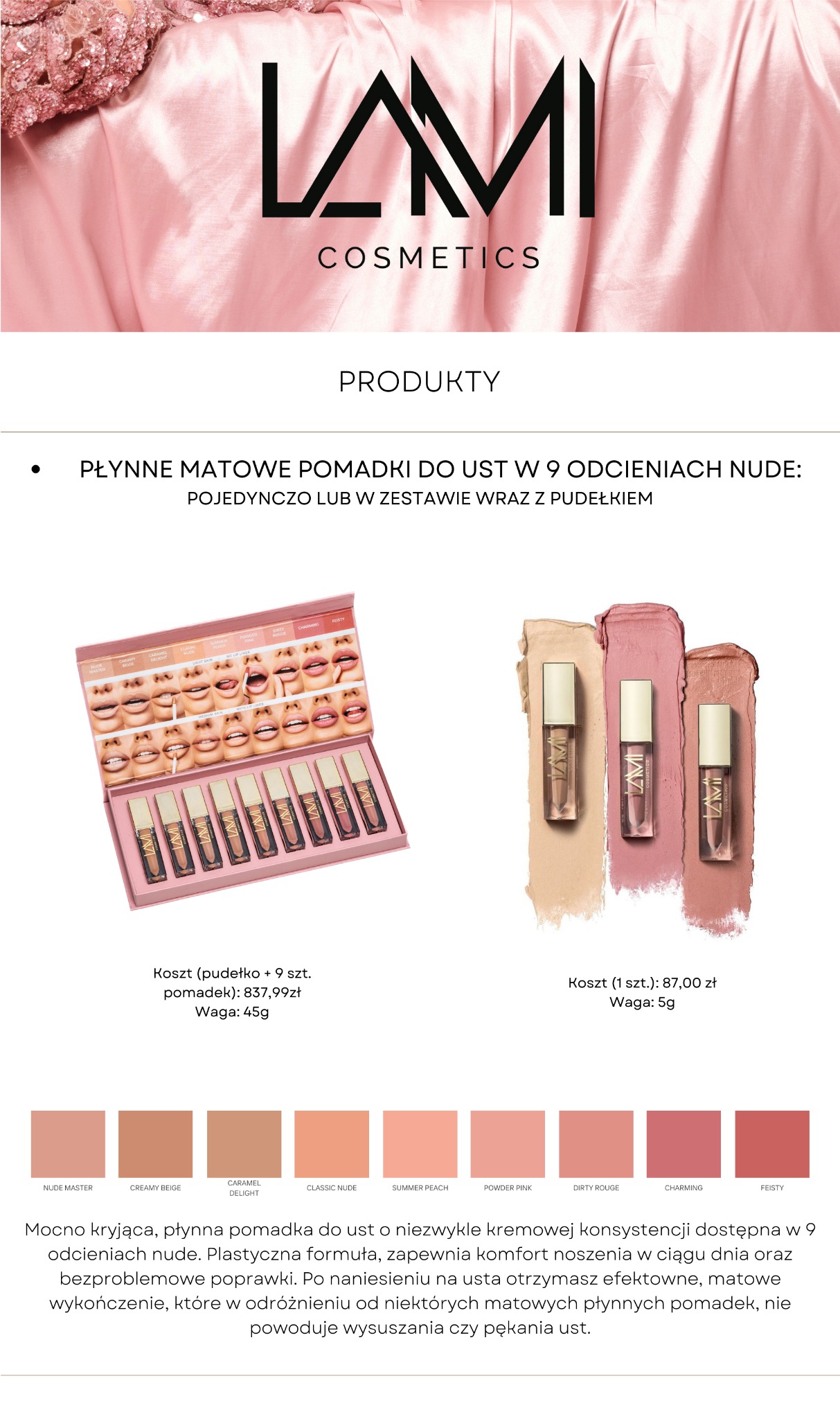 Lami Cosmetics to Polska marka kosmetyczna specjalizująca się w produktach do makijażu. W naszej ofercie znajdują się matowe pomadki do ust w 9 odcieniach nude, płynne rozświetlacze do ciała oraz pędzle. Całą naszą ofertę zobaczysz na www.lamicosmetics.com.pl