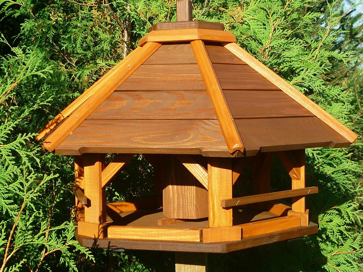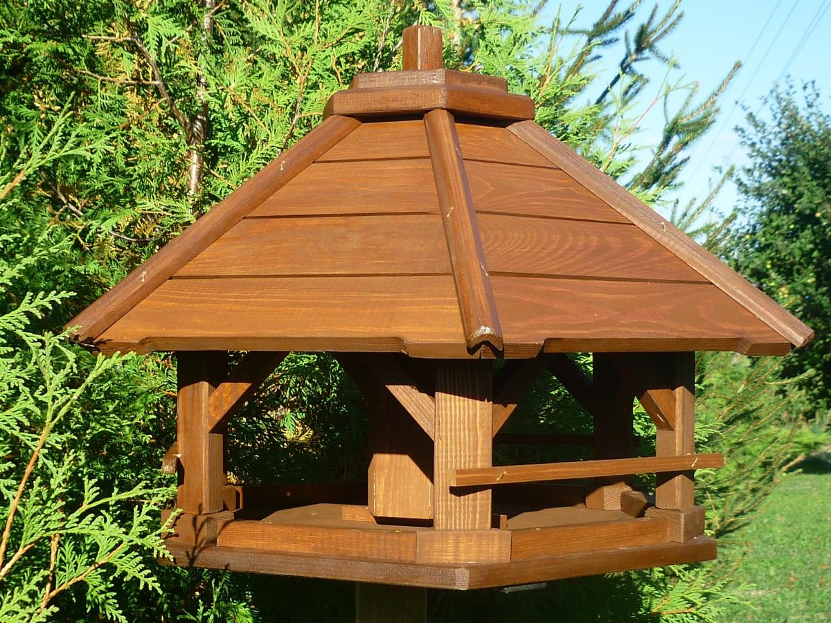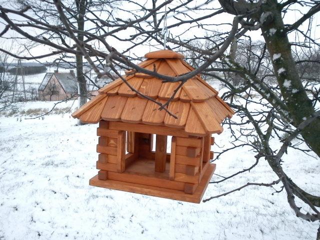 Karmnik dla ptaków drewniany z nasypem, sześciokątny o średnicy 65cm, wysokość 42cm. Wszystkie płaszczyzny karmnika są strugane, natomiast krawędzie załamane. Karmnik jest wewnątrz i zewnątrz zaimpregnowany.