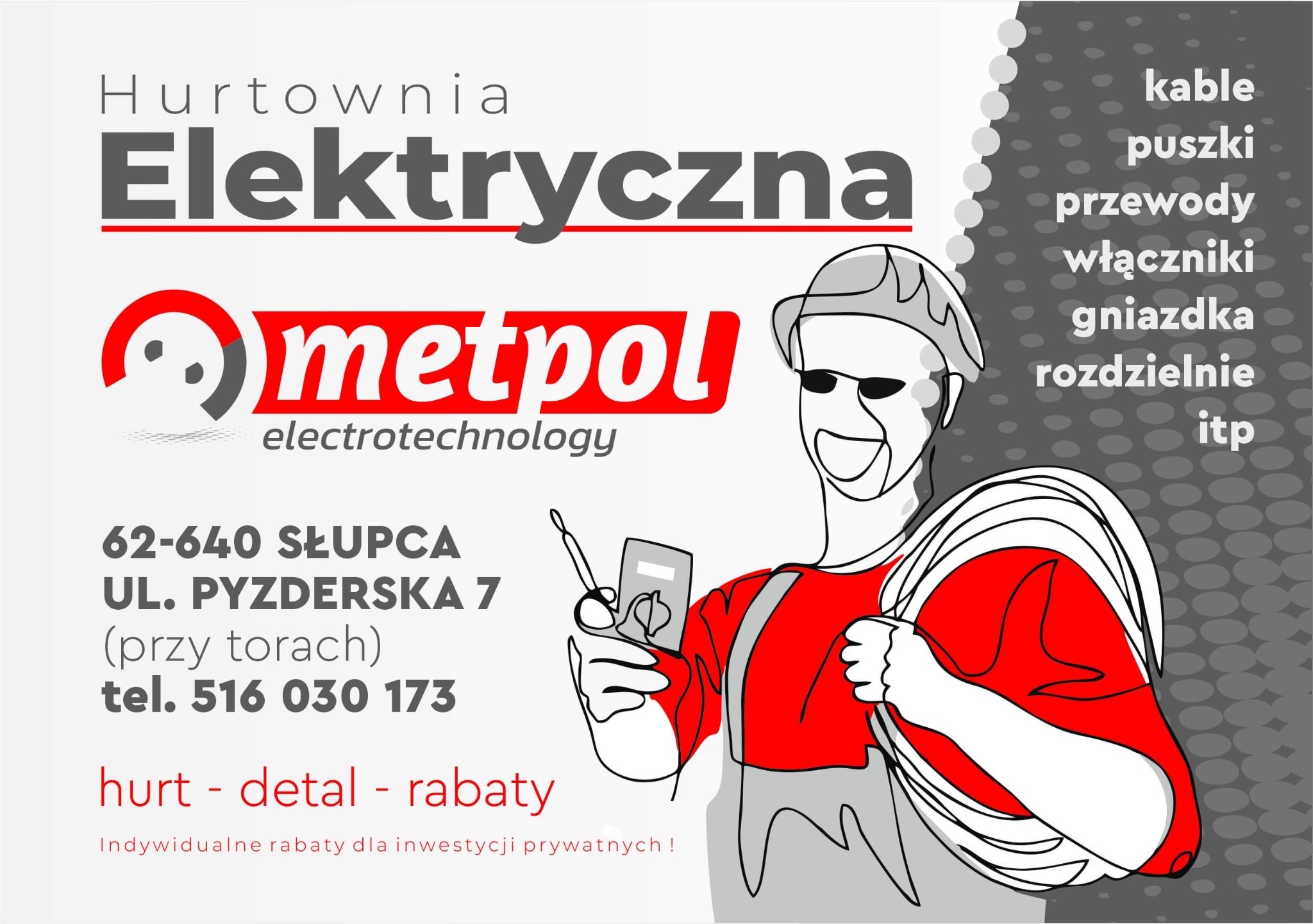 Metpol Hurtownia Elektryczna, atrakcyjne ceny i rabaty dla klientów . Posiadamy w ofercie produkty renomowanych marek, dostarczamy w każde miejsce w Polsce . Nie ograniczamy się tylko do sprzedaży fizycznej tylko towarów , robimy również wyceny. Oprócz elektryki w ofercie również mamy monitoring jaki i fotowoltaikę (kompleksowo od konstrukcji po panele itd.)