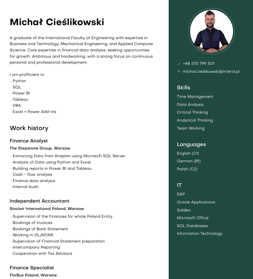 Z zawodu oraz wykształcenia jestem analitykiem finansowym oraz księgowym. Posiadam wieloletni staż w międzynarodowych korporacjach. Specjalizuję się w Power BI oraz Excelu. Od wielu lat analizuję strony przychodowe oraz kosztowe w przedsiębiorstwach, wyciągam wnioski, tworzę rekomendację, a kolejno interaktywne raporty dla Kierownictwa. Znajomość księgowości oraz finansów od podszewki pozwala mi tworzyć raporty z wysokim zrozumieniem danych. Ciągle jestem osobą młodą oraz ambitną. Wysoko cenię sobie realizację zadań w wyznaczonych terminach oraz dokładność. Posiadam własną działalność oraz oferuję możliwość wystawienia faktury VAT. Oferuję najwyższą jakość idącą w parze z atrakcyjnymi cenami.
