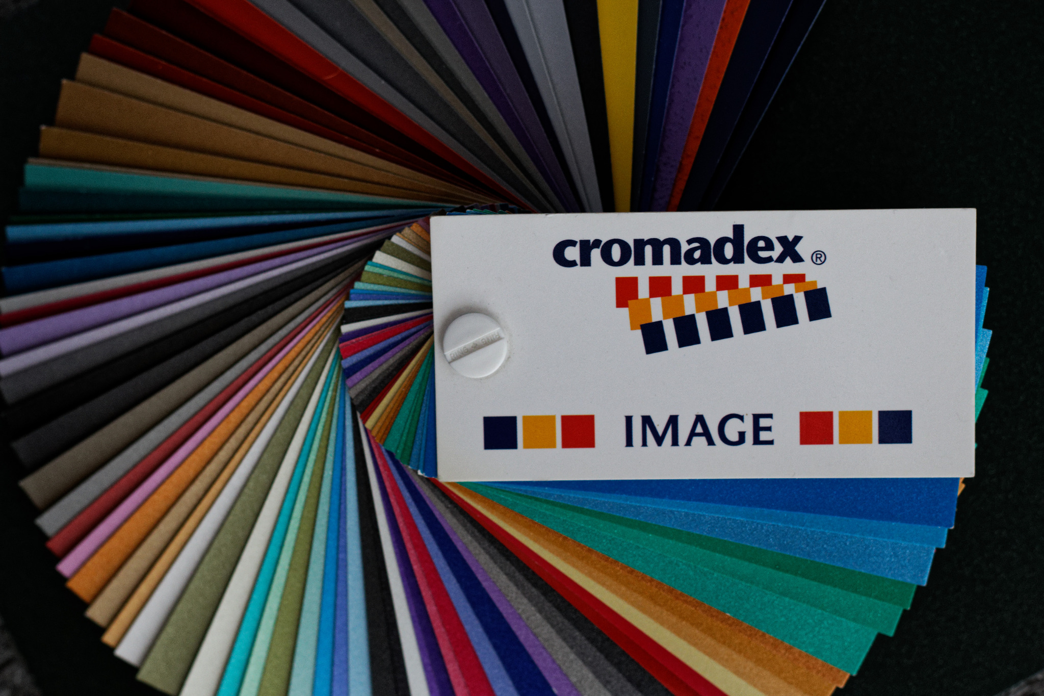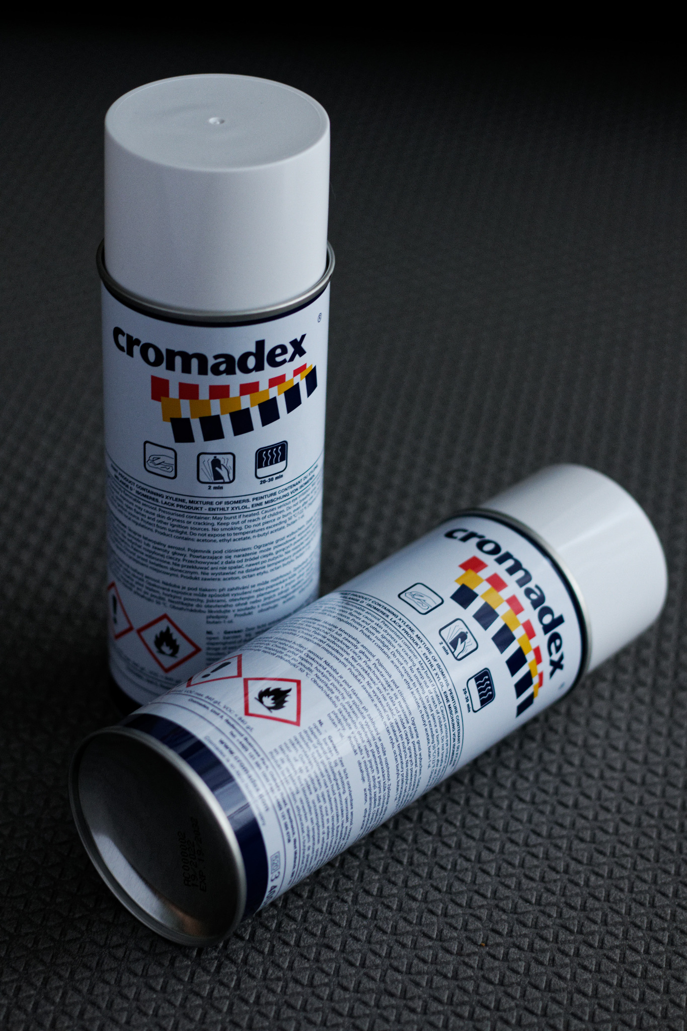 Farba w sprayu Cromadex. Szeroka gama kolorów z palety RAL, NCS, kolory specjalne w różnych stopniach połysku i wykończeniu. Metalik, drobna struktura.