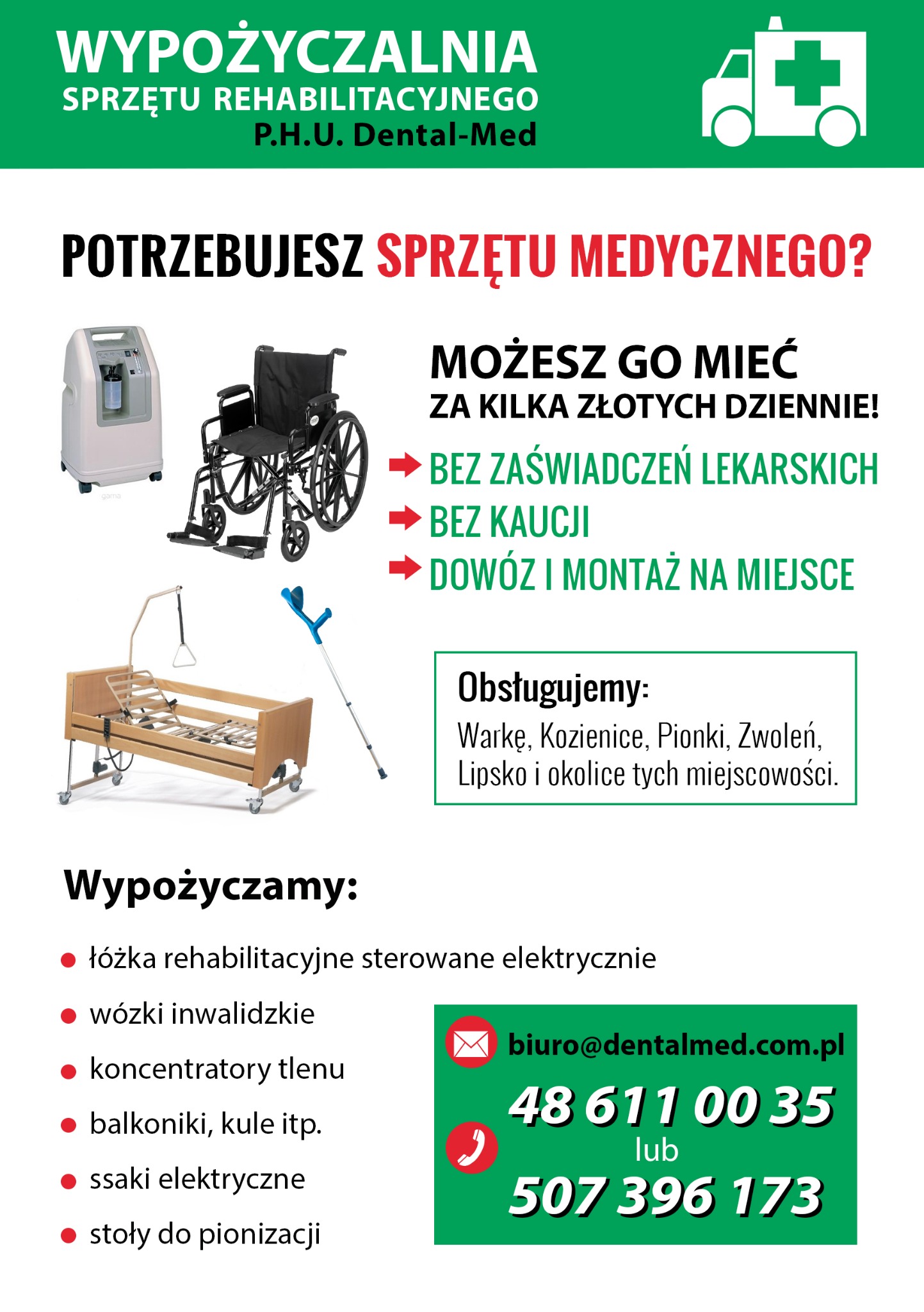 Firma P.H.U. Dental-Med obecna na rynku od 2002r. oprócz sprzedaży detalicznej prowadzi wypożyczalnię sprzętu rehabilitacyjnego i medycznego. W naszej ofercie znajdą Państwo między innymi łóżka rehabilitacyjne, materace piankowe, materace przeciwodleżynowe, koncentratory tlenu, ssaki elektryczne, wózki inwalidzkie, balkoniki, chodziki, kule i inny sprzęt medyczny.