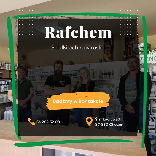 Przedsiębiorstwo RAFCHEM powstało w 2004 roku i od samego początku działalności jego głównym filarem jest detaliczna oraz hurtowa sprzedaż Środków Ochrony Roślin i innych produktów niezbędnych do skutecznej produkcji rolnej. Siedziba firmy RAFCHEM znajduje się się w miejscowości Śmiłowice (gm. Choceń, okolice Włocławka, ok 5km od zjazdu z autostrady A1), położonej w centrum Polski, w sercu malowniczych Kujaw. Dumą naszego regionu są nowoczesne gospodarstwa oraz grupy producenckie o profilu warzywniczo-sadowniczym, które mamy zaszczyt od blisko 20 lat zaopatrywać w środki ochrony roślin.