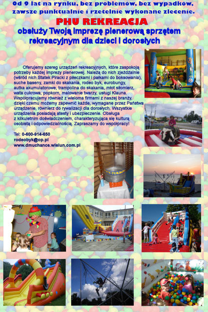 Obsługa imprez plenerowych sprzętem rekreacyjnym dla dzieci: Dmuchańce, zjeżdżalnie, zamek do skakania, suchy basen, kuleczi, eurobungy, bungee, trampolina, rodeo, byk rodeo, mechaniczny byk, autka akumulatorowe, quady, wata cukrowa, popkorn,festyn, atrakcje dla dzieci, zabawki, dmuchane, ślizg, zjeżdżalnia, imprezy plenerowe,