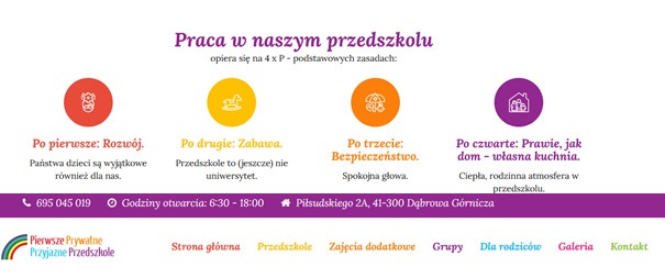 „Nasze przedszkole powstało w 2008r., jako pierwsze przedszkole prywatne na terenie Dąbrowy Górniczej. Zorganizowaliśmy je dla dzieci, których rodzice szukali alternatywy dla przedszkoli państwowych. Podstawowym celem naszego przedszkola zawsze było, jest i będzie być blisko dzieci i ich rodziców. W swojej pracy opieramy się na 4 podstawowych zasadach – 4xP: Po pierwsze: rozwój Po drugie: zabawa Po trzecie: bezpieczeństwo Po czwarte: prawie jak dom.”