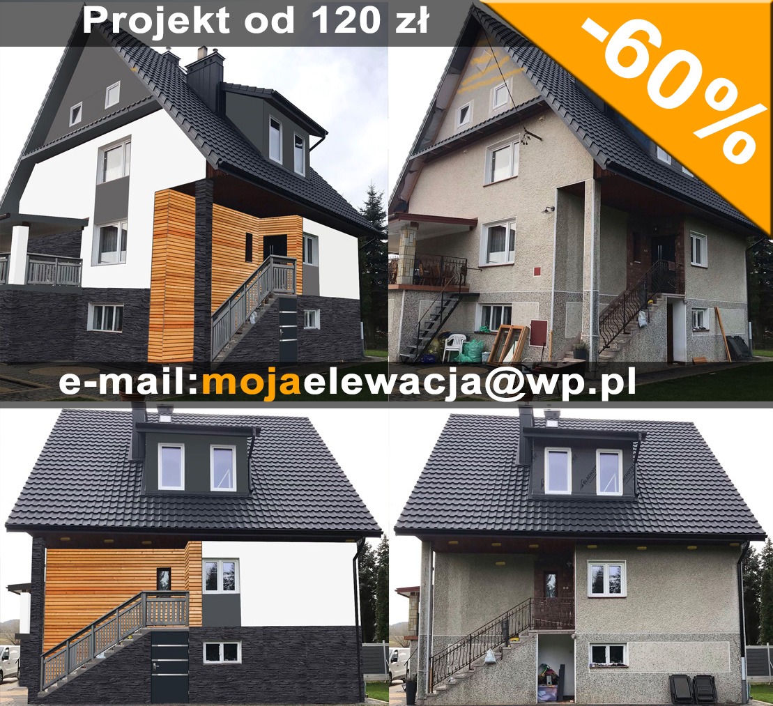 Do realizacji projektu będą potrzebne zdjęcia budynku bądź, elewacje z projektu /dwg. Cena 355 zł zawiera 5 wariantów elewacji z opisem materiałów. Czas realizacji 5 dni roboczych. Po otrzymaniu zdjęć/inspiracji itp. prześlemy więcej szczegółów odnośnie projektu elewacji oraz możliwości płatności.