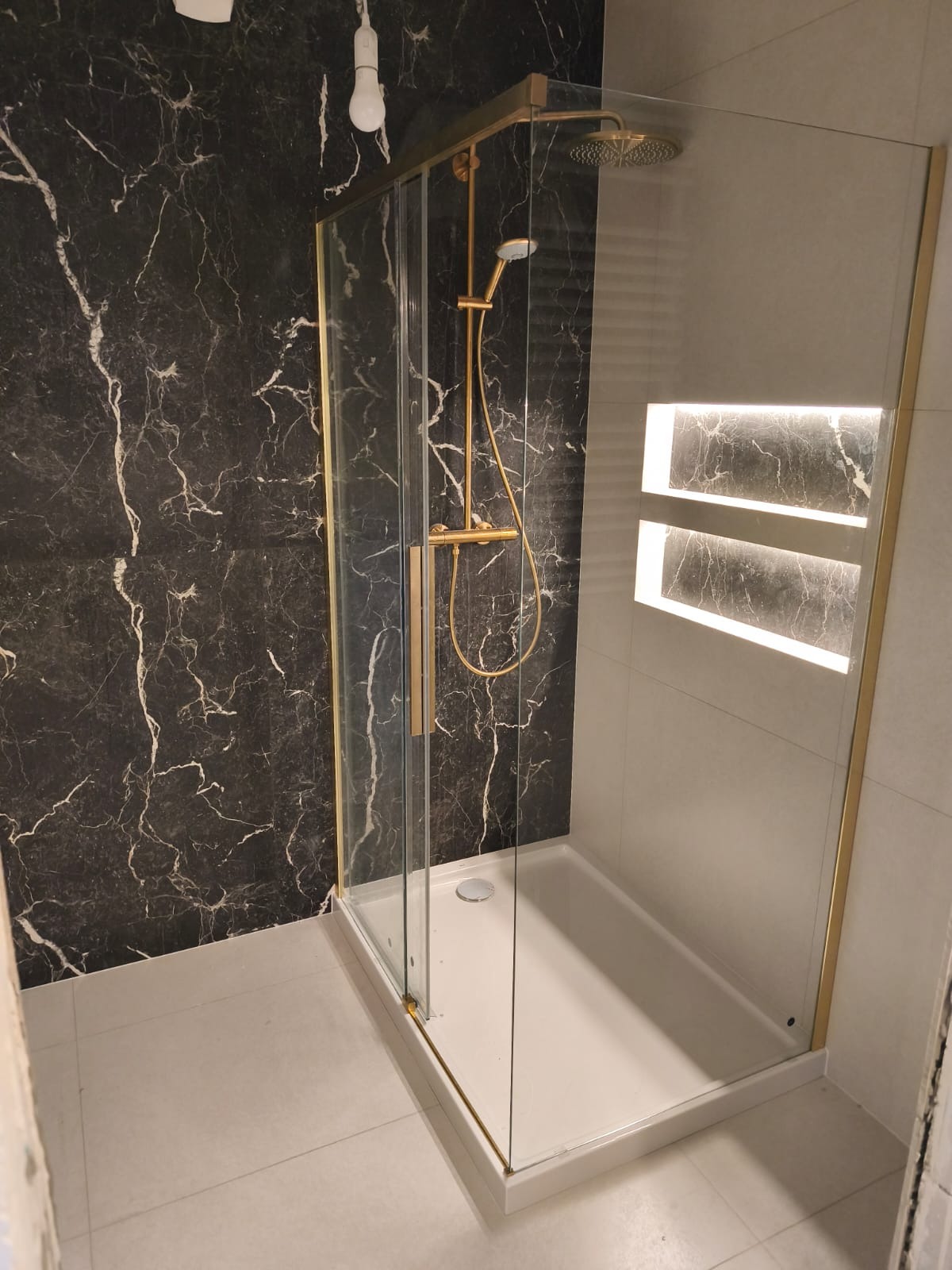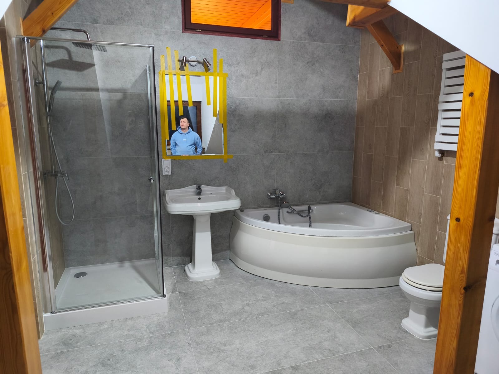 Po wielu telefonach trafiliśmy na Panów, którzy podjęli się wyzwania. Gdy przyjechali na miejsce, ich wprawne oko dostrzegło robotę poprzedniego ”majstra” - partacza, w postaci niestabilnej umywalki, źle przykręconego prysznica i tragicznego wykończenia futryn.