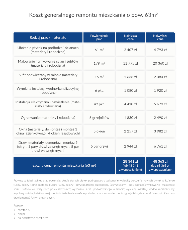Jak pokazują wyniki badań Oferteo.pl, Polacy z reguły chcą przeprowadzić prace remontowe na powierzchni większej niż 41 m2, w wielu pomieszczeniach (w większości przypadków w co najmniej czterech) i zakończyć je najszybciej, jak to będzie możliwe (niemal 50%). Koszt remontu przeciętnego mieszkania może wynieść, w zależności od użytych materiałów i wysokości robocizny, od 28 do 48 tysięcy złotych.