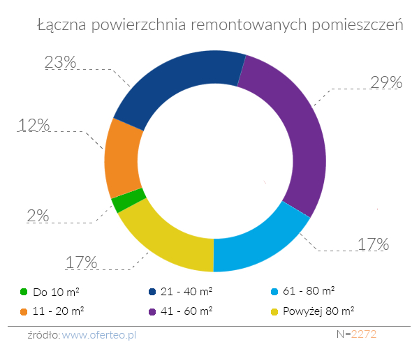 Jeżeli już zabieramy się za remont, to zazwyczaj chcemy przeprowadzić prace w całym mieszkaniu. Użytkownicy Oferteo.pl najczęściej deklarowali, że chcą wyremontować lub wykończyć powierzchnię większą niż 41 m2 – wskazało tak aż 63% z nich. Tylko 2% zapytań dotyczyło prac na powierzchni mniejszej niż 10m2. Warto przy tym zwrócić uwagę na dane Głównego Urzędu Statystycznego, wedle których przeciętne mieszkanie w polskim mieście ma powierzchnię 64,2 m2, a na wsi – 92,3 m2.