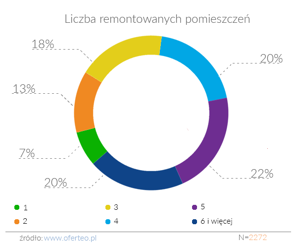 Jak wynika z analizy Oferteo.pl, badani najczęściej wskazywali zamiar przeprowadzenia prac remontowych w czterech lub więcej pomieszczeniach (łącznie 62% wskazań). Chęć remontu tylko jednego pomieszczenia zadeklarowało jedynie 7% użytkowników. Z kolei 13% chciałoby wyremontować dwa pomieszczenia. – Może to wskazywać na fakt, że najczęściej chcemy wyremontować całe mieszkanie, bowiem według danych GUS na statystyczne polskie mieszkanie przypada 3,8 pomieszczenia – komentuje Karol Grygiel, członek Zarządu Oferteo.pl.