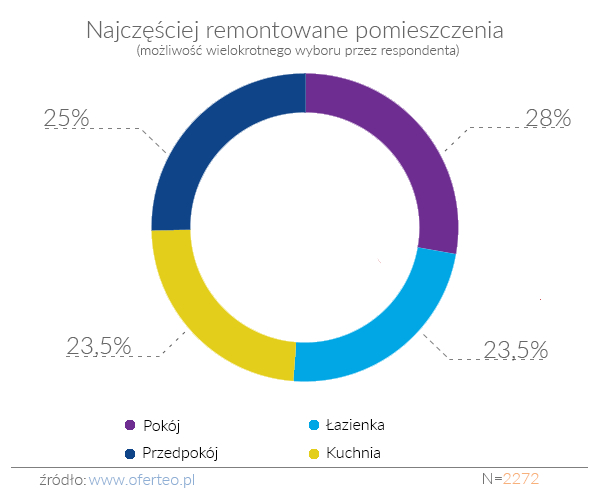 Najczęściej remontowanymi pomieszczeniami były pokoje. Wskazało na nie 28% użytkowników. Nieco mniej wskazań padło na przedpokój (25%) oraz na łazienkę i kuchnię (po 23,5%).