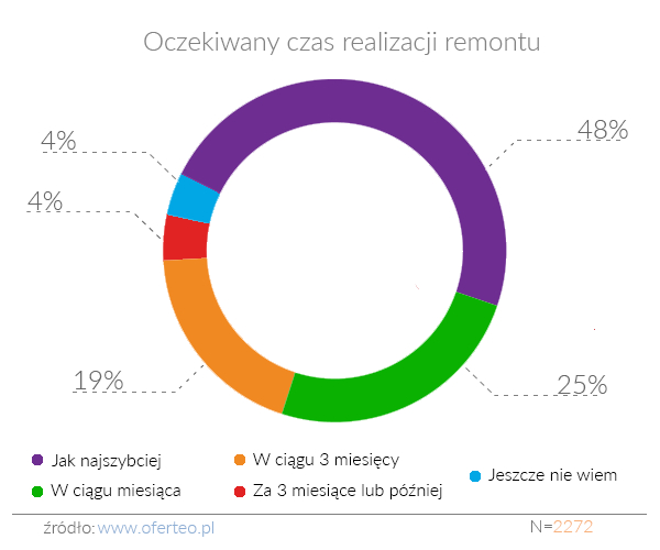 Prawie połowa zleceniodawców stwierdziła, że chce zrealizować remont jak najszybciej. Jedna czwarta użytkowników wskazała, że chciałaby zrealizować remont w ciągu miesiąca, a co piąty użytkownik – w ciągu trzech miesięcy. Tylko 4% zleceniodawców planowało remont z przynajmniej trzymiesięcznym wyprzedzeniem. Plany 4% użytkowników były na etapie na tyle wstępnym, że nie wskazali jeszcze dokładnego terminu prac.