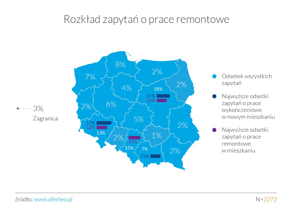 Najwięcej zapytań dotyczących remontów i wykończeń mieszkań łącznie złożyli mieszkańcy województw mazowieckiego (18%), śląskiego (15%) i dolnośląskiego (13% ogólnej liczby zapytań). Co ciekawe, 3% zapytań pochodziło z zagranicy: najwięcej z Niemiec, a w dalszej kolejności z Norwegii, Holandii i Austrii, a więc kierunków często wybieranych przez polskich emigrantów, którzy później zlecają w Polsce wykonanie prac.