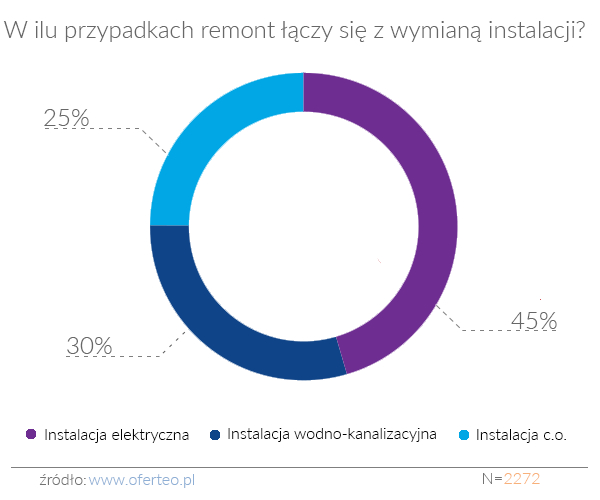 Jak się okazuje, najbardziej pożądana w polskim mieszkaniu jest wymiana, rozbudowa lub przeróbka elektryki – potrzebowało tego 45% użytkowników serwisu. Remont instalacji wodno-kanalizacyjnej planowało 30% użytkowników, a 25% było zainteresowanych wymianą instalacji c.o.