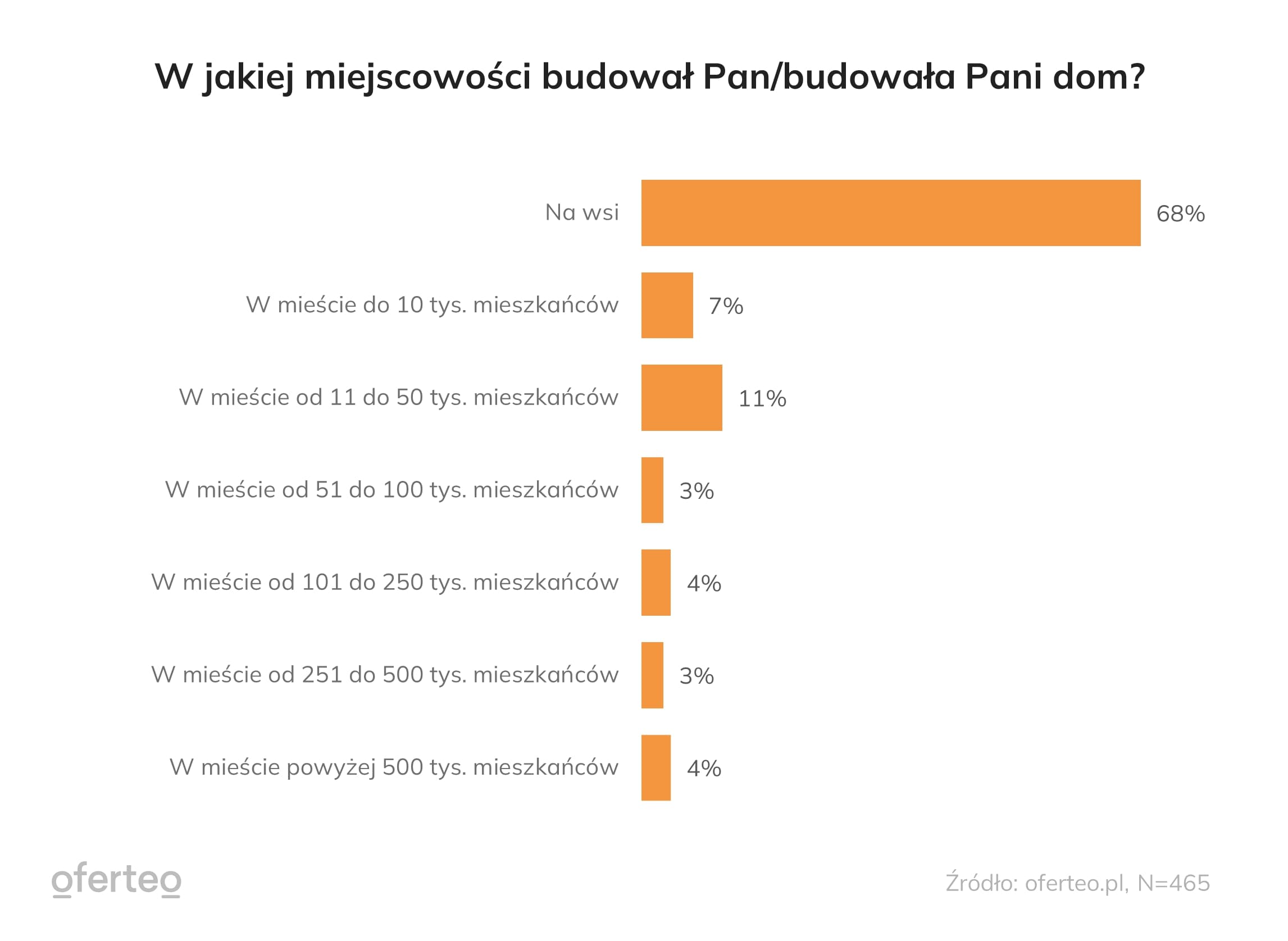 Większość ankietowanych (68%) decydowała się na budowę domów na terenach wiejskich. 7% nowych domów powstało w miastach o liczbie mieszkańców do 10 tys., a 11% – w miastach o liczbie mieszkańców od 11 do 50 tys.