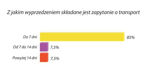 Z analizy zapytań ofertowych portalu Oferteo.pl wynika, że osoby zamierzające zlecić usługi transportowe poszukują firm dyspozycyjnych, ponieważ zapytanie składają do tygodnia wcześniej przed planowanym czasem rozpoczęcia transportu (85% respondentów). W pozostałej populacji tyle samo osób wskazywało, że załadunek ich towaru będzie możliwy dopiero za tydzień lub co najmniej 2 tygodnie (w obu przypadkach 7,5%).
