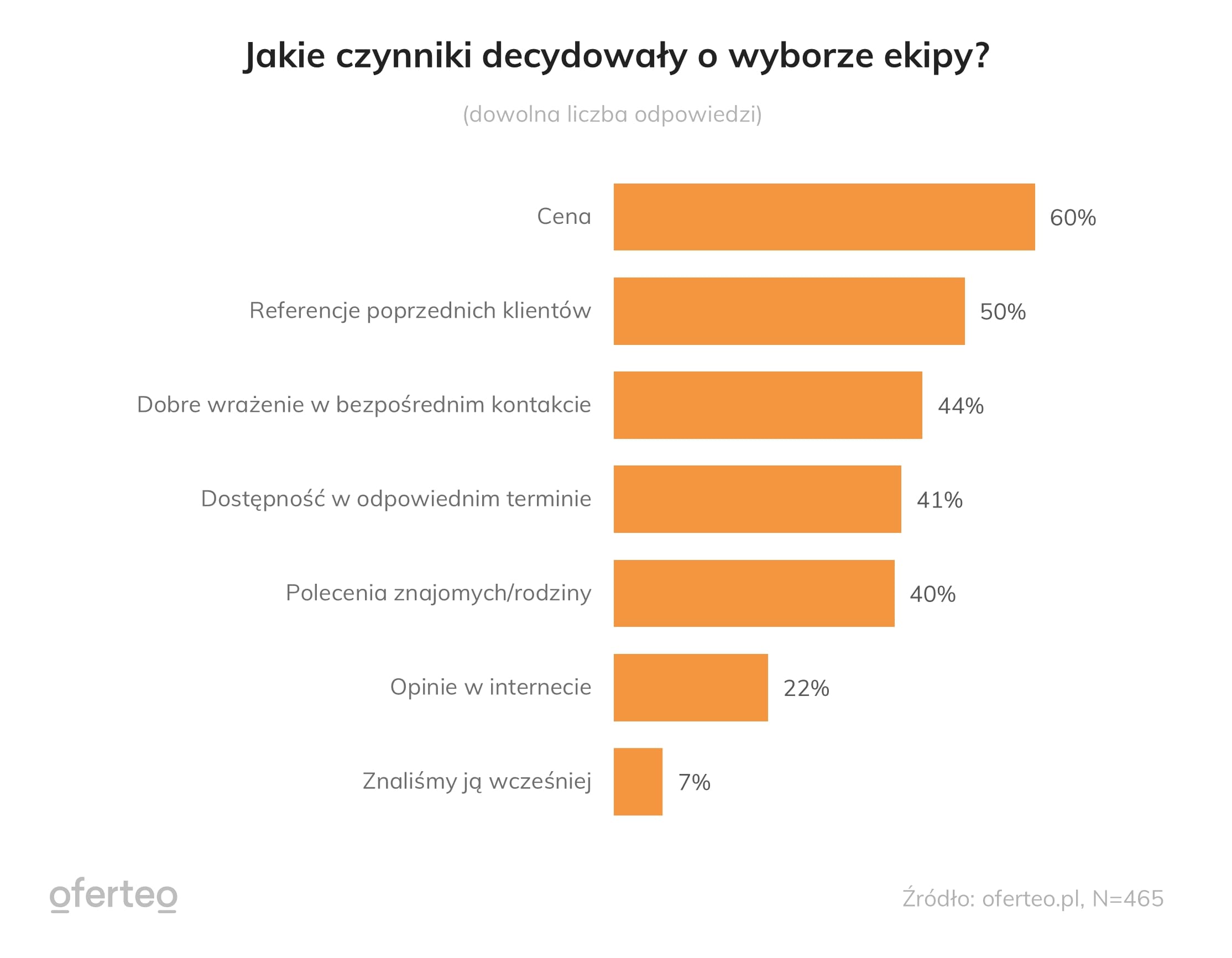 Znalezienie odpowiedniej i sprawdzonej ekipy może stanowić wyzwanie. Wśród czynników wpływających na decyzje inwestorów najczęściej wskazywano na referencje poprzednich klientów. Takiej odpowiedzi udzieliła blisko połowa ankietowanych. Kolejnymi ważnymi kwestiami były również: cena usług (43%) oraz wrażenie, jakie wywarła ekipa w bezpośrednim kontakcie (41%). Rzadziej kierowano się poleceniem znajomych (39%), dostępnością (37%) czy opiniami w internecie (25%). Zaledwie 14% ankietowanych wskazało, że przy wyborze zdecydowała wcześniejsza współpraca z danymi wykonawcami.