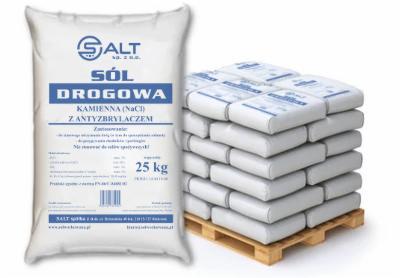 Sól pakowana jest w worki 25 kg z wysokiej jakości folii PE z nadrukiem. Na palecie jest 1 tona soli (40 worków), zabezpieczona na czas transportu folią stretch.