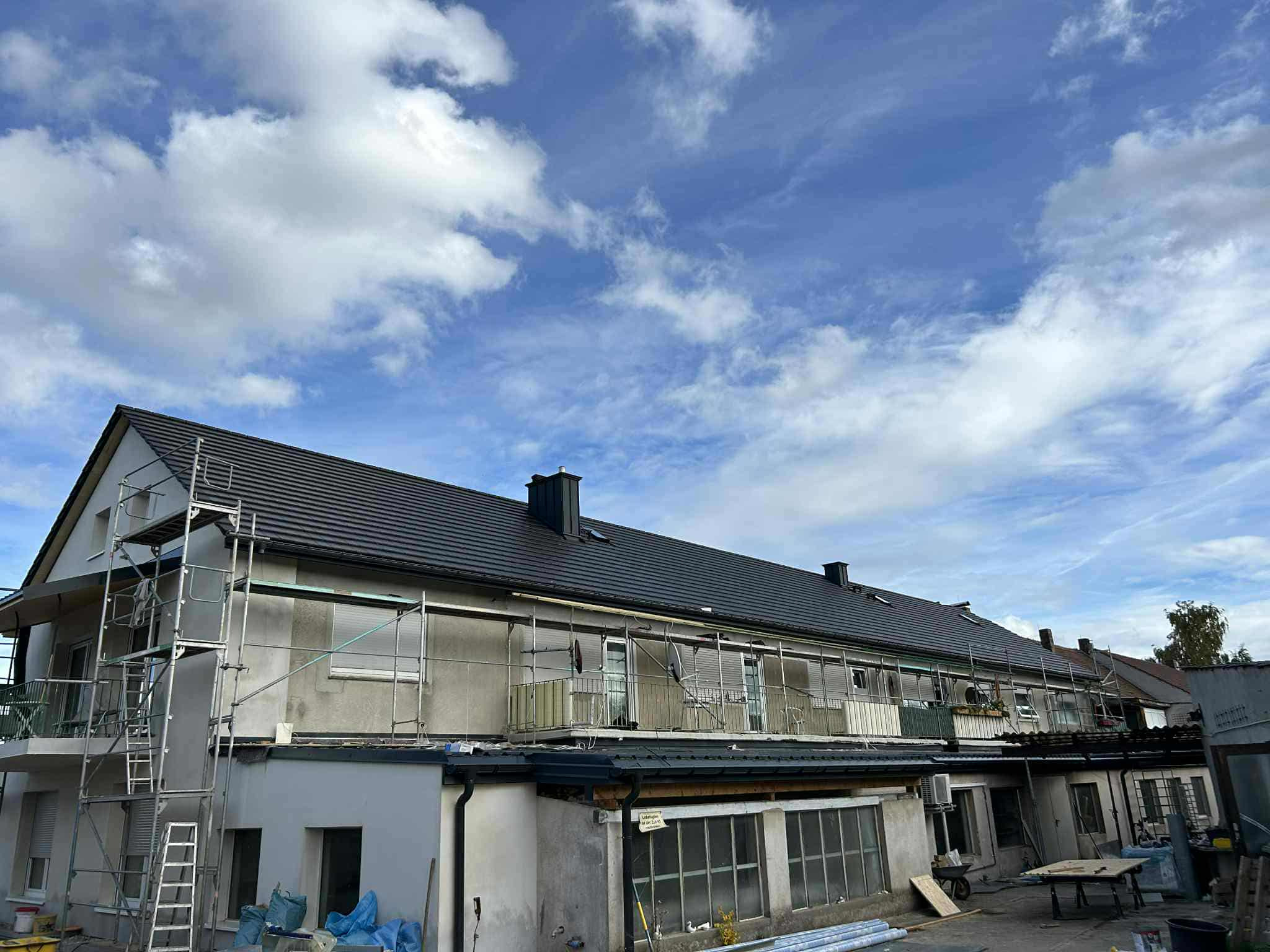 Firma wykonała wymianę całego pokrycia dachu na nowe (blachodachówka, obudowa dwóch dużych kominów, śniegołapy, rynny, wyłaz dachowy, wiatrownica, ławy kominiarskie) wraz z dociepleniem od zewnątrz połaci dachowym wełną mineralną co wymagało zwiększenia grubości starych krokwi plus nowe łaty, kontrłaty.