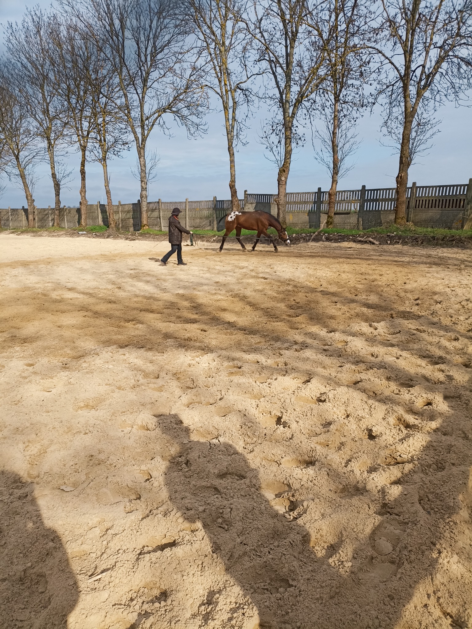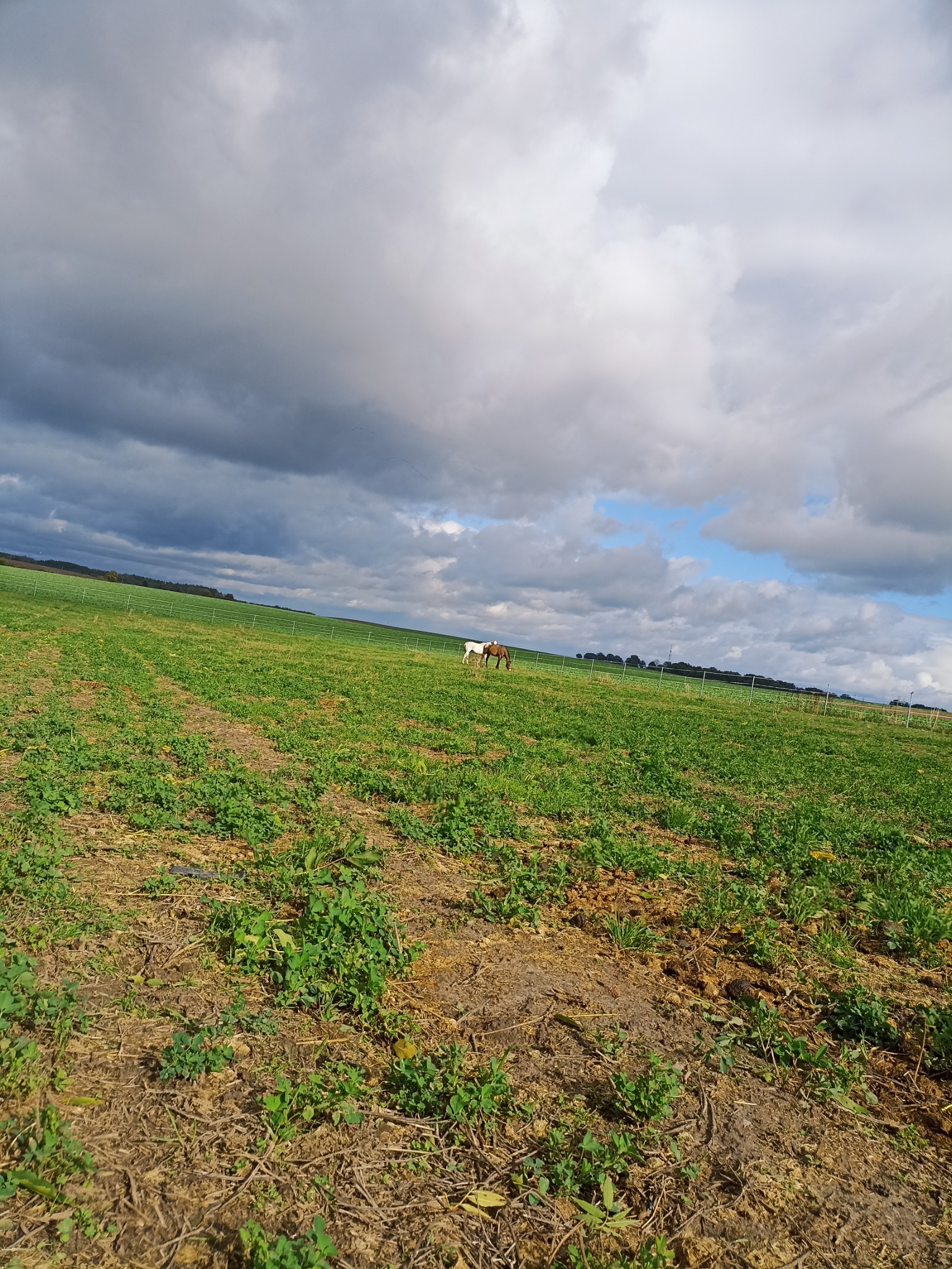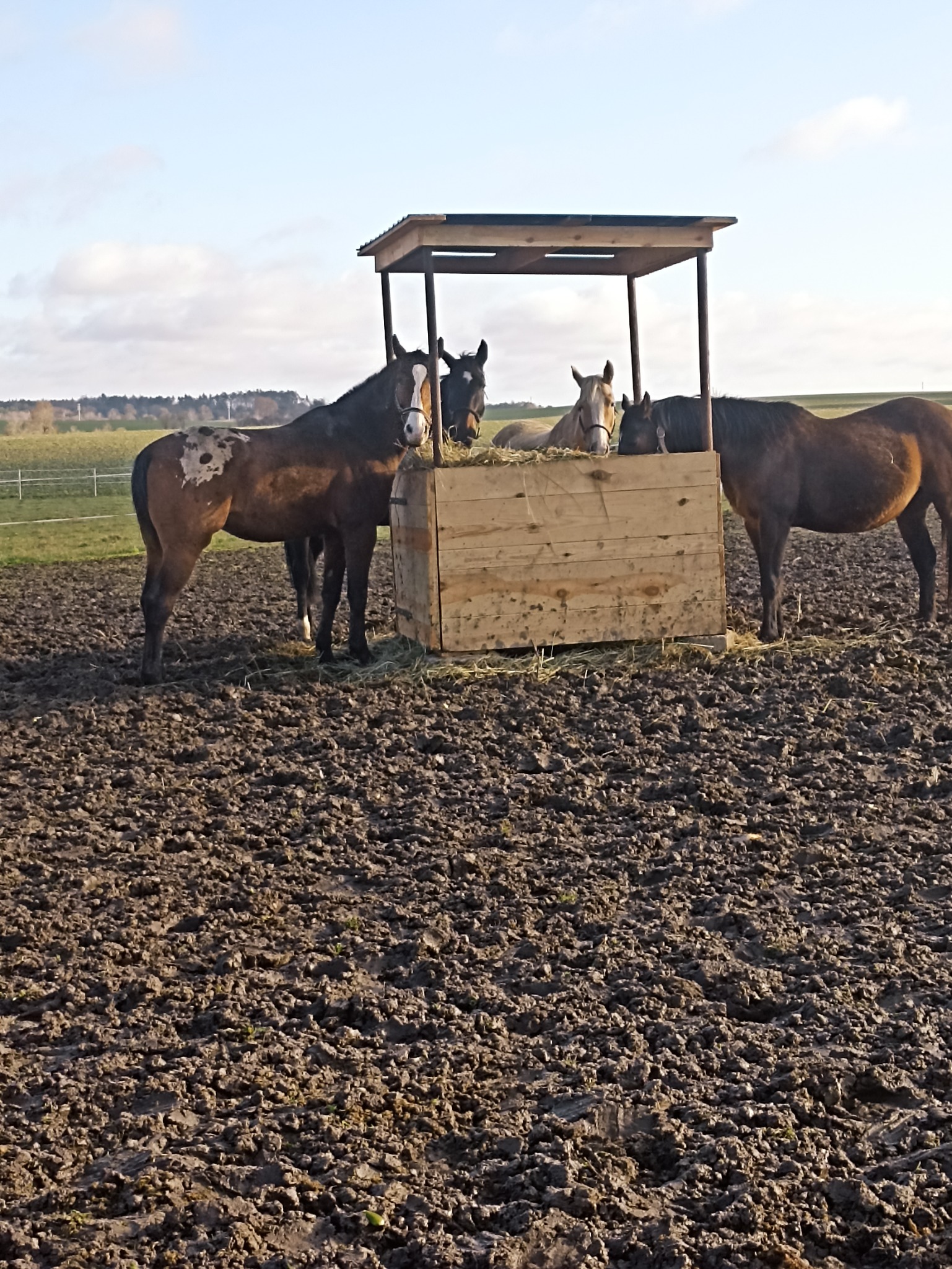 Padok z dużą wiatą, wyścielona słoma. Na padoku paśnik z sianem i stały dostęp do wody.