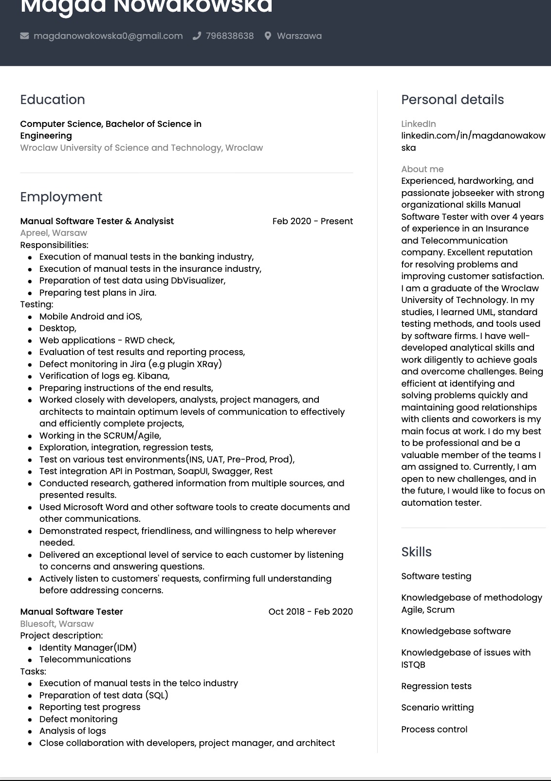 Mam ponad 4 lata doświadczenia w branży IT jako tester manualny(wykonuje testy zarówno na web, aplikacje komórkowe, jak i API) na terenie calej Polski. Wykonuje swoja prace sumiennie i z należyta uwaga. Obecnie poszukuje nowych wyzwań z tej dziedziny.