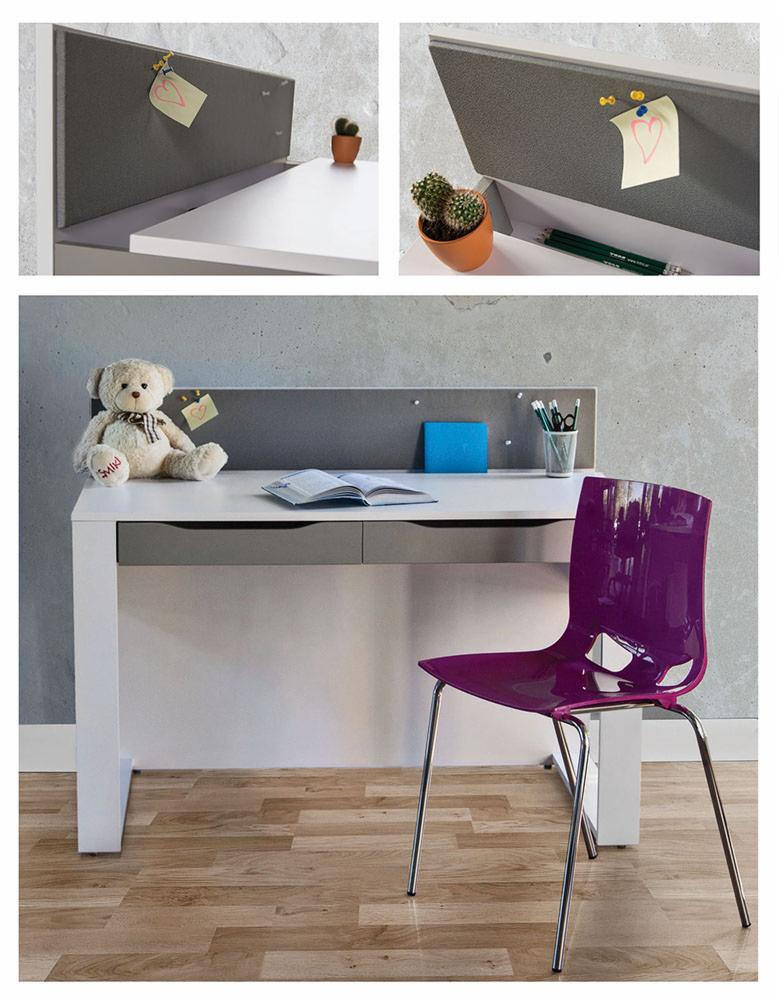 Nowoczesne, dwu szufladowe biurko młodzieżowe, stawiające na niebanalne rozwiązania. Łączy w sobie tapicerowaną tablicę korkową, do której można przypiąć ważne notatki czy zdjęcia z użyteczną wnęką na drobne przedmioty.