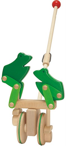 Posiada koła z gumową obwódką dzięki czemu pchacz prowadzi się miękko i cicho.