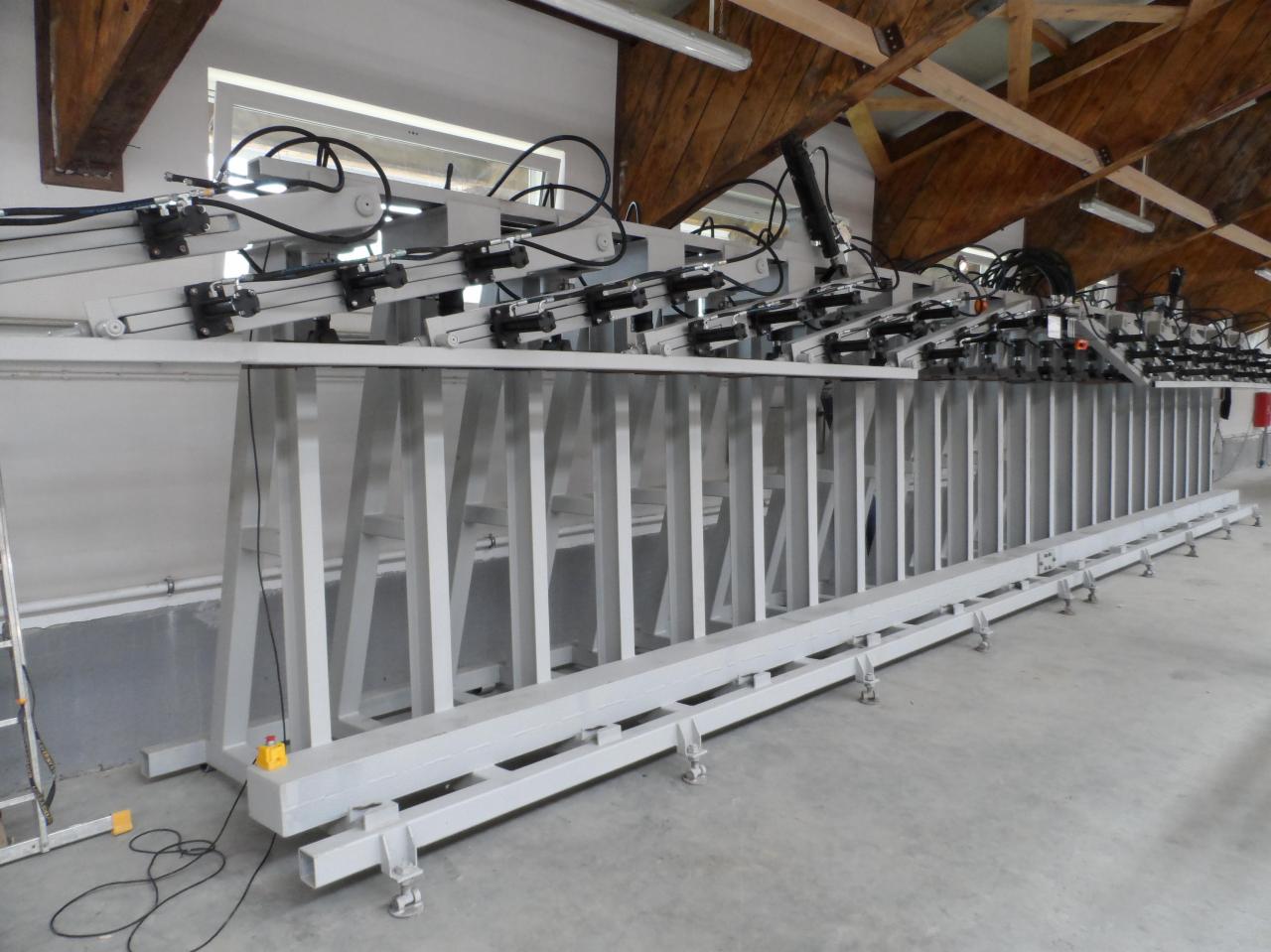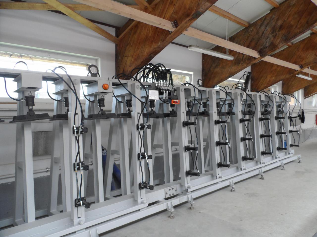 hydraulicznego docisku wyrównującego wsad, są wahliwie osadzone na konstrukcji i połączone cięgnem, sprzęgnięte z siłownikiem hydraulicznym pozwalają w bardzo szybki i łatwy sposób opróżniać prasę.Konstrukcja posiada własne poziomowanie i pionowanie przez zastosowanie śrub regulacyjnych. Urządzenie jest wyposażone w dwie pompy hydrauliczne: pompę zalewową i pompę pomocniczą utrzymującą stałe ciśnienie w trakcie trwania procesu klejenia. Maszyna posiada sygnalizację świetlną i dźwiękową. Podstawową wielkością jest moduł prasy o długości 6 m, z możliwością rozbudowy o kolejne moduły.